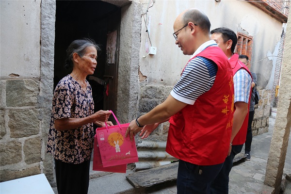 在简单的启动仪式过后,泉州市伍氏特香包有限公司为本次活动捐赠400盒爱心月饼,各文明单位志愿者带着慰问品,在社区工作人员的带领下分散到全区8个街道38个社区,到200户困难群众家中开展爱心帮扶和中秋慰问活动。