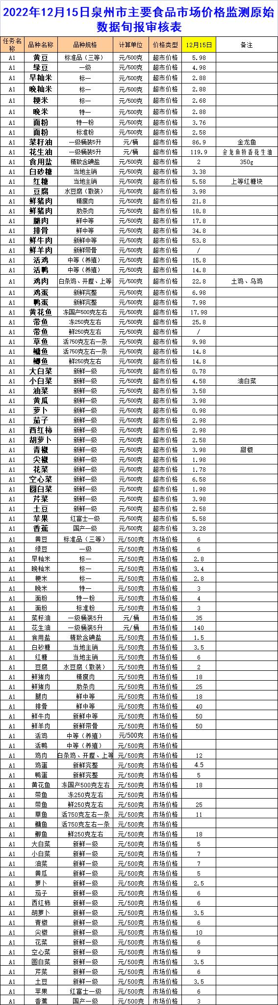 2022年12月15日泉州市主要食品市场价格监测原始数据旬报审核表
